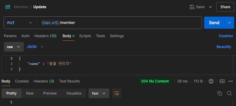 요청 헤더에 'accessToken', 요청 Body 에 수정 정보를 담아 요청하기만 하면된다. DB 를 통해 수정한 정보가 잘 반영되는 것 또한 확인했다.