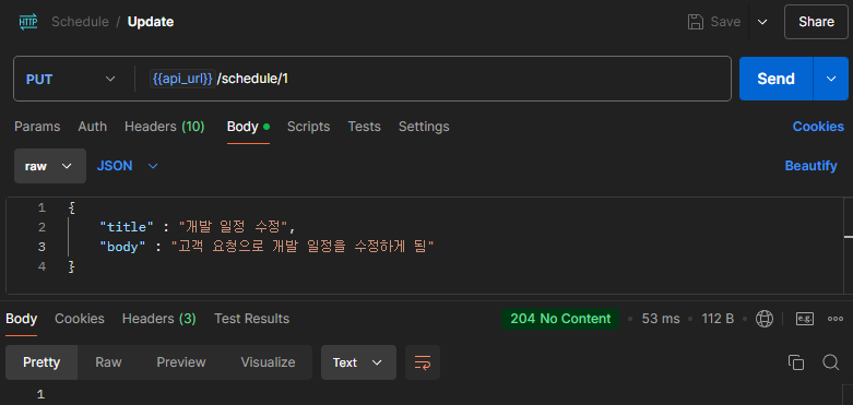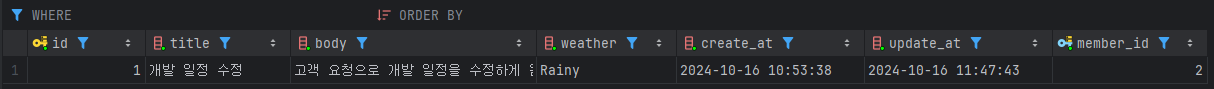 수정 내용이 해당 일정에 잘 반영된 것을 확인할 수 있다. 또한 수정일(update_at) 또한 수정할 때의 날짜/시간으로 수정되었다.