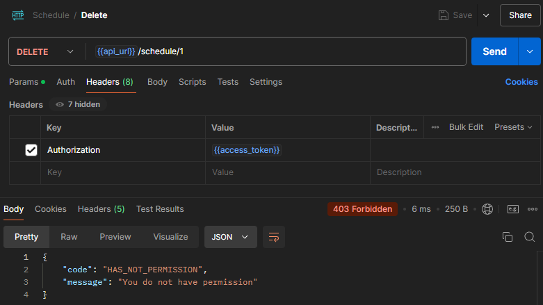 회원의 권한이 'USER(일반 회원)' 인 회원(개발자1)과 'ADMIN(관리자)' 인 회원(관리자)가 존재한다. 먼저 '개발자1' 로 로그인해 얻은 AccessToken 으로 일정의 수정과 삭제를 요청한 결과는 아래와 같다.
