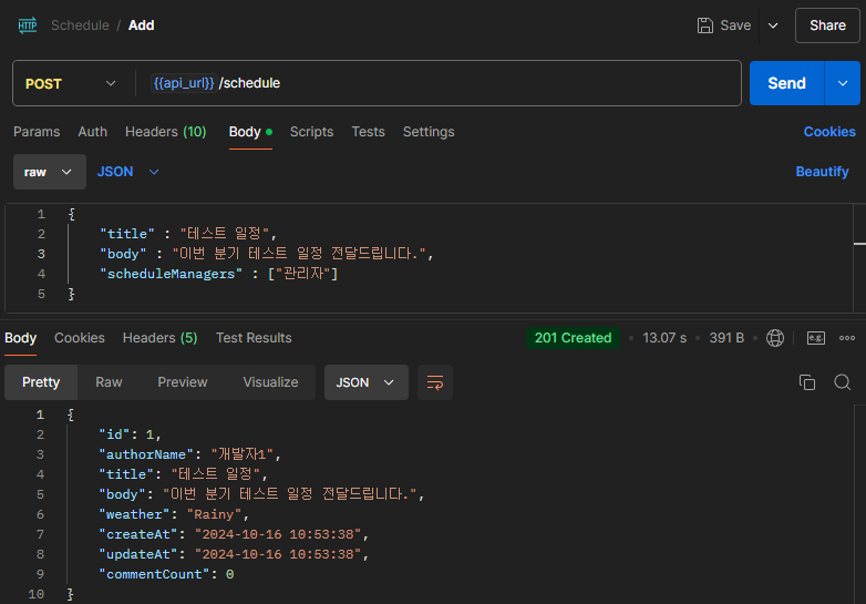 일정 생성시 더 이상 쿼리 파라미터로 작성자의 정보(id)를 전달 받을 필요가 없다. 필터에서 '인증/인가' 를 수행후 요청 사용자의 정보를 DB 에서 조회해 HttpServletRequest 에 담아 전달해주기 때문에 Controller 에서 사용자 정보를 꺼내 Service 에 전달해주기만 하면 된다. 또한 날씨 정보를 제공하는 외부 저장소(Open API)를 활용하기에 Open API 에 필요 데이터를 요청(GET)하고 전달 받은 데이터 중 필요한 데이터(오늘 날씨)를 Schedule 엔티티에 저장한다.