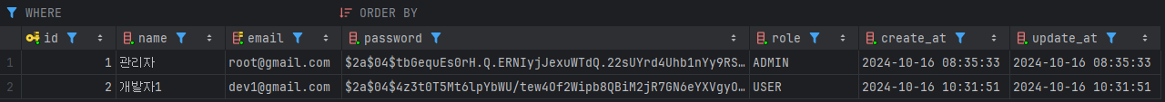 이전에 관리자 계정을 직접 DB 에 아래와 같이 추가해 두었고 테스트를 위해 일반 회원 또한 MEMBER 테이블에 추가해 두었다. 요구사항이 제대로 반영이 되었다면 일반 회원이 수정 또는 삭제를 요청하면 요청이 수행되지 않아야 하고, 관리자 계정으로 요청할 경우 요청(정상 요청일 때)이 제대로 수행되어야 한다. 아래는 현재 MEMBER 테이블의 상태이다.