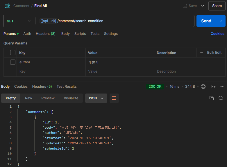 기존에 댓글 목록 조회시 댓글 작성자의 이름을 검색 조건으로 사용할 수 있도록 구현해 두었다. 검색 조건을 만족(LIKE, 유사일치)하는 댓글들을 반환하며, 검색 조건에 만족하는 댓글이 없다면 빈 목록을 반환한다. 만약 검색 조건이 없는 경우 전체 댓글 목록을 반환한다.