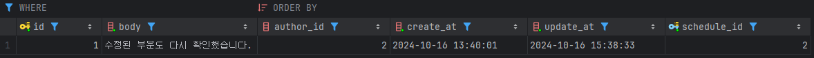 API 테스트 응답만으로는 요청이 제대로 수행됬는지 확인할 수 없으므로 COMMENT 테이블 또한 확인해, 수정 요청대로 댓글 본문이 수정되었으며 수정일 또한 수정시기로 바뀐 것을 확인할 수 있었다.