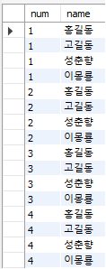 자칫 너무 큰 결과 집합을 반환될 수 있으므로 직접 테이블을 생성해 CROSS JOIN 을 사용해 보았다. 테이블 NUMS 에는 'num' 컬럼이 존재하고 각 행은 '1~4' 의 값을 갖는다. 테이블 NAMES 에는 'name' 컬럼이 존재하고 각 행은 임의의 이름(중복 X)을 갖는다. 이 때 'num' 과 'name' 으로 만들 수 있는 모든 조합을 레코드로 갖는 결과 테이블을 반환한다.