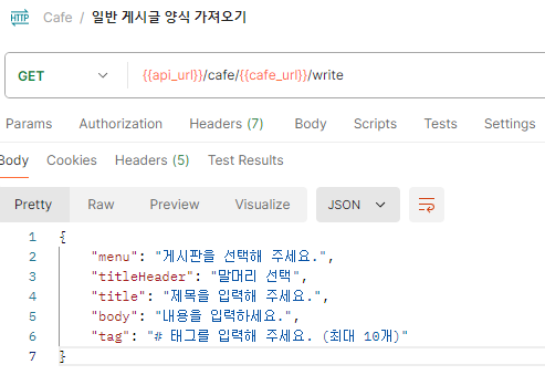 일반 게시글 작성 양식에 필요한 기본 정보 요청 결과, 필요한 기본 정보들이 잘 반환 되었다.