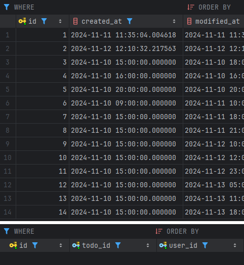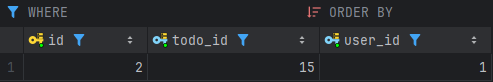 TODOS 테이블에는 'id=15, user_id=1' 인 새로운 행이 추가되었으며, MANAGERS 테이블에는 'todo_id = 15, user_id = 1' 인 행이 추가되었다. 그리고 해당 요청으로 인해 작성되는 쿼리를 확인해보니 기존에 있던 사용자 조회, 일정 추가 쿼리 외에도 매니저 추가 쿼리 또한 작성되는 것을 확인할 수 있었다.