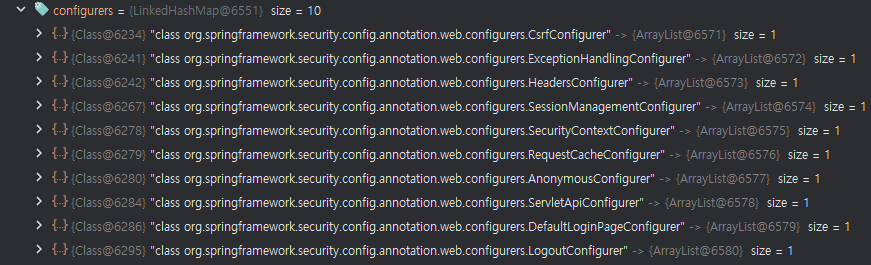 그리고 이후 formLogin() 과 httpBasic() 을 통해 2개의 설정 클래스가 추가 되어 HttpSecurity.configurers 의 size 가 증가되는 것을 확인했다. 설정 클래스를 추가했기에 해당 필드의 크기가 증가한 것 같다.