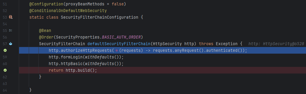 우선 실습에 사용한 프로젝트는 별다른 보안 설정을 작성하지 않았기에 '기본 보안' 이 적용된 상태이다. 그래서 이전 게시시물에서 이야기한 SpringBootWebSecurityConfiguration.SecurityFilterChainConfiguration 클래스의 defaultSecurityFilterChain() 에 브레이크 포인트를 걸었다.