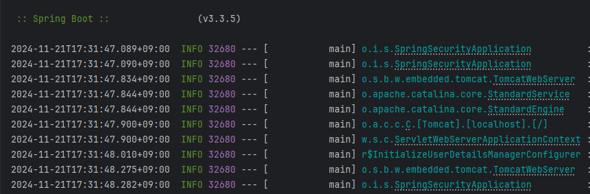 설정후 애플리케이션을 실행하니 실행창이 좀 달라졌다. 분명 이전에는 자동으로 생성된 계정에 대한 패스워드(UUID)가 실행창에 출력되었는데 이번에는 출력되지 않았다. 이로인해 계정을 자동으로 생성하는 것도 보안설정과 마찬가지로 설정한 사용자 정보가 있다면 자동으로 생성하지 않는 다는 것을 확인할 수 있었다.