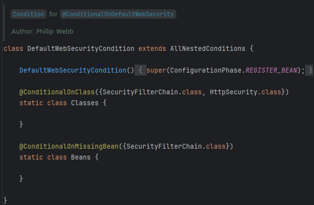 위의 내용은 SpringBootWebSecurityConfiguration.SecurityFilterChainConfiguration 클래스의 defaultSecurityFilterChain() 에 지정된 @ConditionalOnDefaultWebSecurity → @Conditional 에 지정된 DefaultWebSecurityCondition 클래스를 통해 알 수 있었다.
