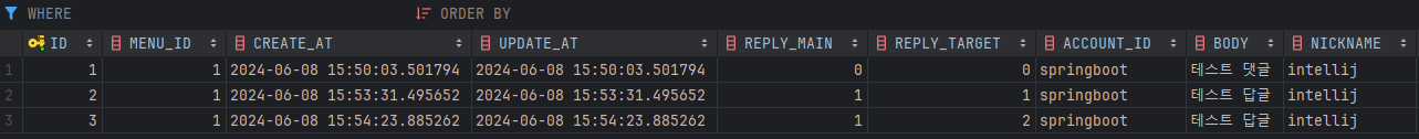 우선 기존에 존재하던 댓글(id=1)에 답글을 작성하고, 작성한 답글(id=2)에 다시 새로운 답글을 작성하는 테스트를 진행했다. 두 API 요청 모두 정상적으로 완료되어 결과 메시지가 반환되었고, DB를 확인해 보면 첫 번째 답글(id=2)과 두 번째 답글(id=3)의 메인 댓글의 id는 '1'이며, 답글의 대상 댓글의 id는 각각 '1', '2'이다. 물론 댓글이 작성된 게시글 엔티티의 CommenCount 값은 '3'으로 증가하였다.