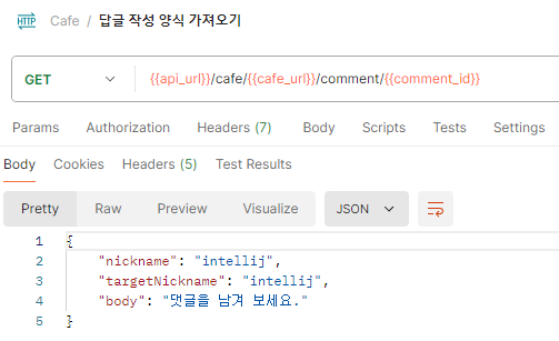 답글 작성양식에 필요한 정보를 요청한 테스트 결과이다. 답글 대상 댓글의 작성자 닉네임과, 답글 작성자의 닉네임, 그리고 본문에 작성을 알리는 기본 메시지가 잘 반환된 것을 확인할 수 있다.