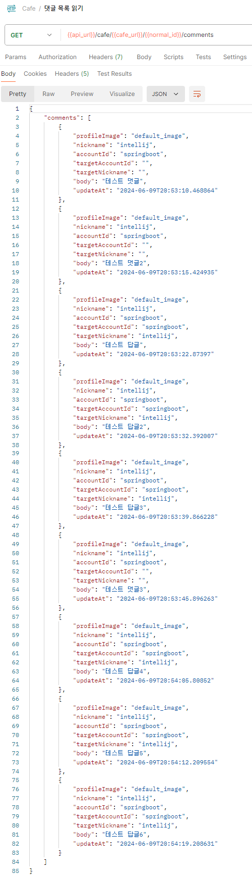 게시글(id=1)이 가지는 모든 댓글(+답글) 목록 정보를 요청하는 API 테스트 결과이다. 게시글에 작성된 댓글만 추린 후, 작성일을 기준으로 내림차순 정렬을 한 뒤, 댓글그룹으로 한 번더 내림차순으로 정렬해 Comment 리스트로 반환한 정보들이다. 덕분에 기존 네이버 카페 게시글 댓글과 같이 댓글 정보를 노출하는 것을 볼 수 있다.