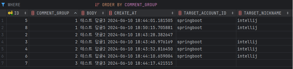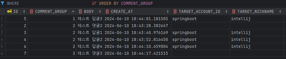 댓글이 삭제되면 당연하게도 답글을 작성할 순 없지만, 삭제된 댓글의 답글에는 답글을 작성할 수 있는데 그 경우를 테스트한 결과이다. 댓글1(id=1)이 삭제된 상태에서 답글3(id=5)에 답글을 작성하였고 생성된 댓글이 잘 추가 된 것을 확인 할 수 있다. 또한 이전에 말한 것처럼 작성일은 늦을지 몰라도 댓글그룹1에 포함되는 답글이므로 답글3 다음에 노출되는 것을 확인 할 수 있다.