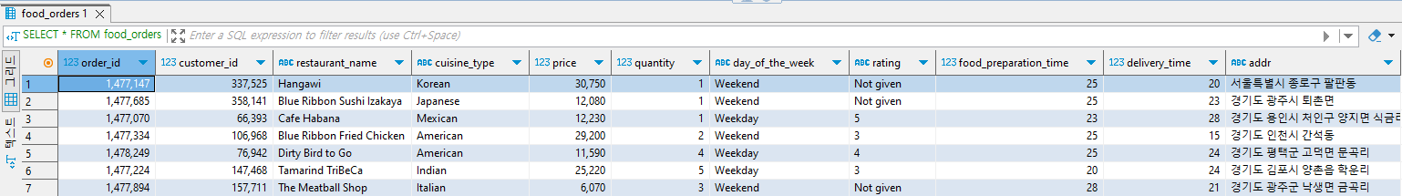'food_orders' 의 'order_id' 과 'customer_id' 에 속하는 데이터들을 조회하였으며 결과 이미지를 통해 지정한 속성들에 해당하는 데이터들이 조회된 것을 확인할 수 있다.