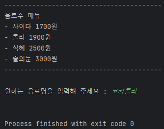 * 만약 존재하지 않는 음료를 입력하면 실행이 종료된다.