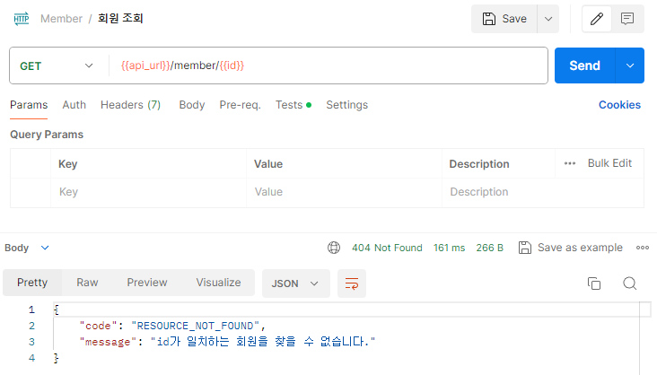 회원을 등록하지 않은 상태로 id를 통해 회원을 조회한 테스트이다. 없는 회원을 조회하였기에 에러가 발생하며, 에러코드와 메시지가 출력되며 사용자에게 id와 일치하는 회원을 찾지 못했다는 정보를 제공, 사용자에게 좀 더 질 좋은 서비스를 제공할 수 있게 된 것이다!