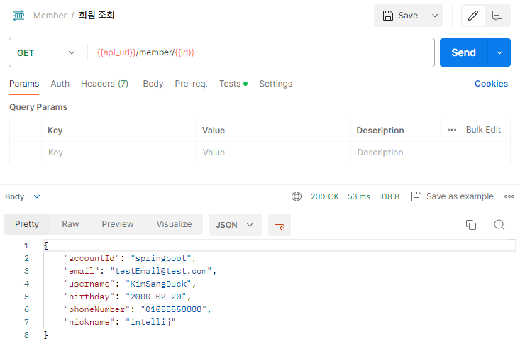 회원 등록을 한 상태에서 등록된 회원의 id(=1)를 통해 회원의 정보를 조회하였다. 원하는대로 id, 계정 비밀번호 정보를 제외한 나머지 정보가 정상적으로 출력된 것을 볼 수 있다.