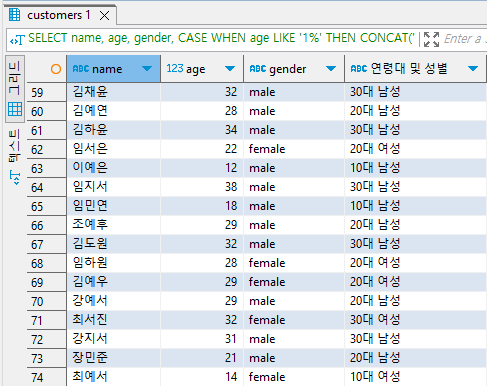 WHERE 를 사용해 10세 이상 40세 미만의 고객들을 추리고 CASE 를 사용해 연령대와 성별을 한 눈에 확인할 수 있는 컬럼을 결과에 추가했다. 또한 IF 를 조건 충족 값 지정시 사용해 성별에 "male" 을 가지고 있다면 "남성" 을 아니라면 "여성"을 출력, 이를 CONCAT 으로 합쳐 하나의 문자 데이터로 만들었다.