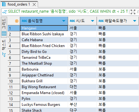 'food_orders' 테이블에서 각 음식점(본점, 분점 따로)별 위치한 '시/도' 의 정보와 배달의 평균 소요시간을 평가한 결과를 출력해보자. 배달 평균 소요시간의 평가 기준은 25분 미만이라면 '빠름', 25분 이상 40분 미만은 '보통' 그리고 그 외의 경우는 '느림' 으로 평가한다.