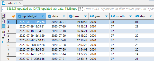 'orders' 테이블의 'updated_at' 컬럼의 날짜/시간 데이터를 DATE, TIME 타입과 날짜, 시간, 연, 월, 일 형식으로 변환한 결과를 출력하는 쿼리를 작성해보자.