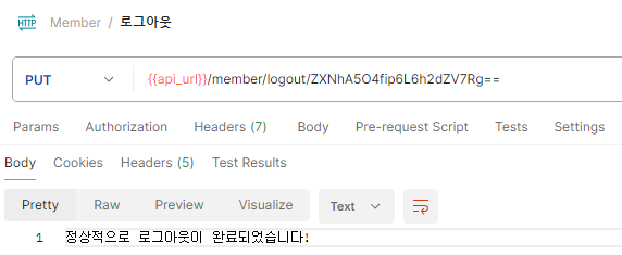 API 요청 URL에 로그인시 생성된 토큰을 담아 로그아웃을 요청하니 정상적으로 완료 메시지가 출력되는 것을 확인할 수 있었다. DB 상에서도 "login"이었던 STATUS가 "logout"으로 바뀐 것을 확인하였다.